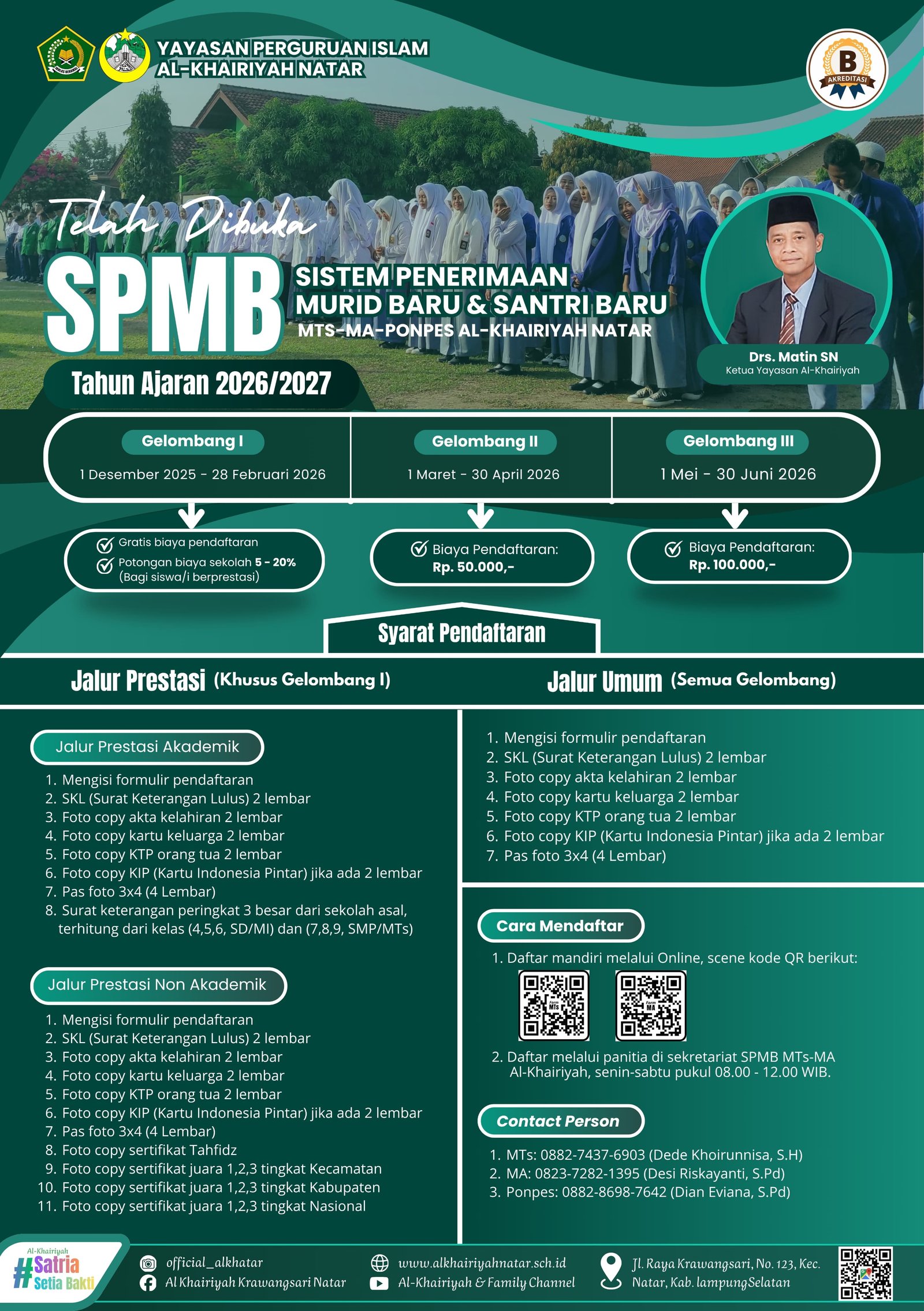 Diinformasikan kepada seluruh pendaftar spmb YPI AL-KHAIRIYAH NATAR bahwa pendaftaran sudah dibuka, ada pun jadwal tertera di bawah ini:
